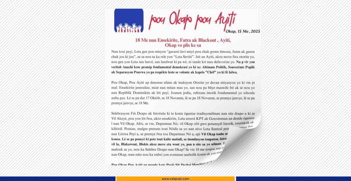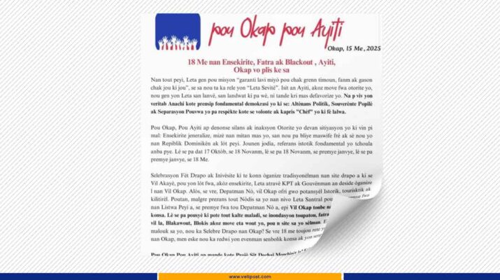 En cette veille du 18 mai 2025, l’organisation politico-sociale “Pou Okap, Pou Ayiti”, condamne l’attitude passive et déconnectée du pouvoir central, incapable d’assurer les missions de base d’un État moderne. Pour cette structure militante, la Fête du Drapeau ne peut pas être réduite à un simple défilé folklorique alors que le pays sombre dans la misère, la saleté, le noir et la peur.