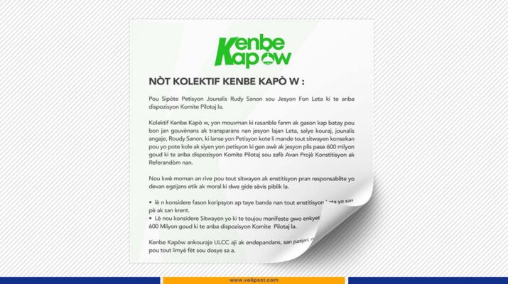 Le collectif Kenbe Kapò W, un mouvement citoyen engagé pour la transparence et la bonne gouvernance en Haïti, a exprimé son appui au journaliste Roudy Sanon, à l’origine d’une pétition réclamant des éclaircissements sur la gestion d’un fonds public de plus de 600 millions de gourdes alloué au Comité de pilotage de l’avant-projet de Constitution et du référendum.