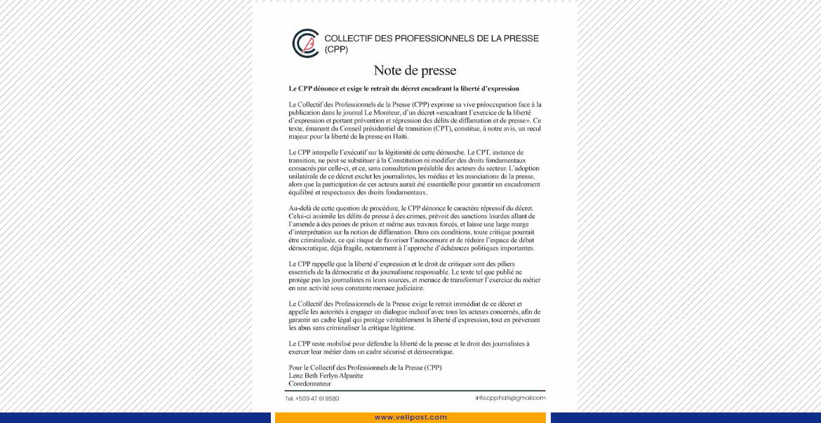Le Collectif des Professionnels de la Presse (CPP) monte au créneau contre le décret publié dans Le Moniteur encadrant l’exercice de la liberté d’expression et la répression des délits de diffamation et de presse. Dans une note officielle, l’organisation de journalistes estime que ce texte, pris par le Conseil présidentiel de transition (CPT), représente un sérieux recul pour la liberté de la presse en Haïti.