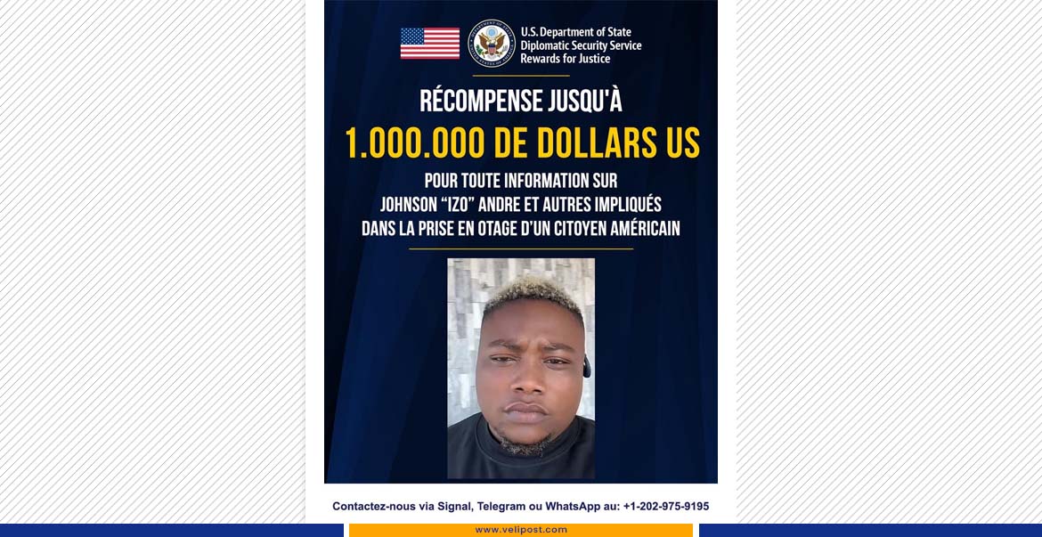 Les États-Unis ont annoncé, via le U.S. Department of State, une récompense pouvant atteindre un million de dollars pour toute information menant à l’arrestation de Johnson “Izo” André, présenté comme chef du gang 5 Segond.