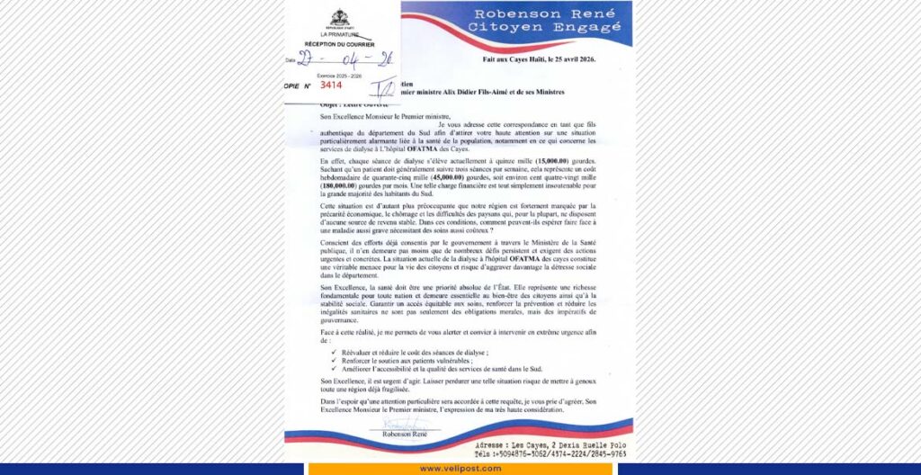Datée du 25 avril 2026, la correspondance met en lumière le prix actuel d’une séance de dialyse, fixé à 15 000 gourdes. Pour les patients atteints d’insuffisance rénale, nécessitant en moyenne trois séances par semaine, la facture s’élève à environ 45 000 gourdes hebdomadaires, soit près de 180 000 gourdes par mois.